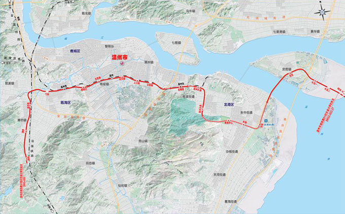 S1線一期工程:西起沿海鐵路溫州南站南端潘橋鎮(zhèn),向東北繞出至溫州西站,沿既有金溫鐵路通道至溫州東站,過溫州東站后線路折向西南沿龍灣區(qū)南洋大道、前房路至機(jī)場,在機(jī)場航站樓西側(cè)設(shè)機(jī)場站,出站后向北跨甌江南口至靈昆島折向東至一期工程終點(diǎn)甌采站。